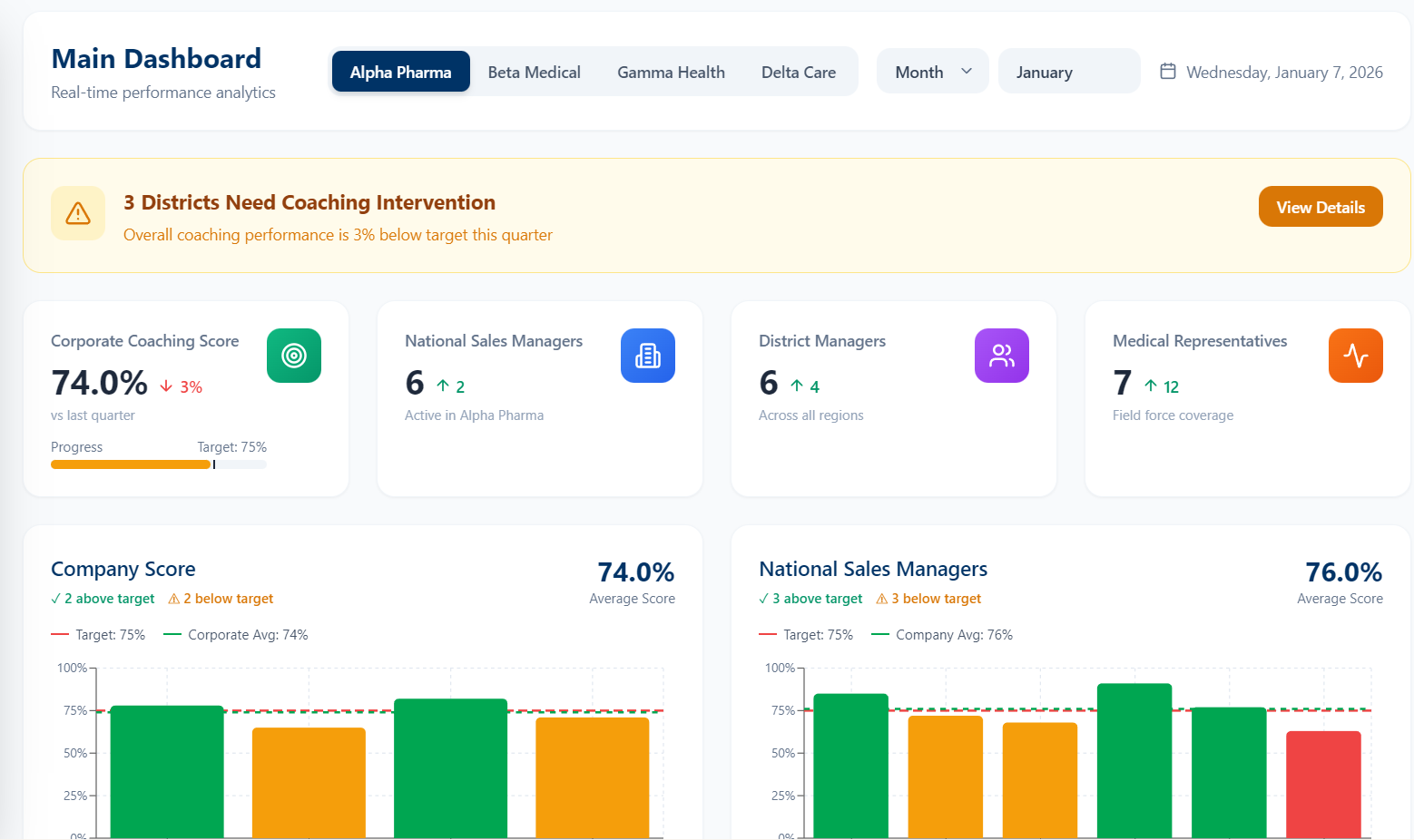 A unified coaching and performance management internal system for pharmaceutical companies. Drive accountability, track progress, and achieve measurable results.